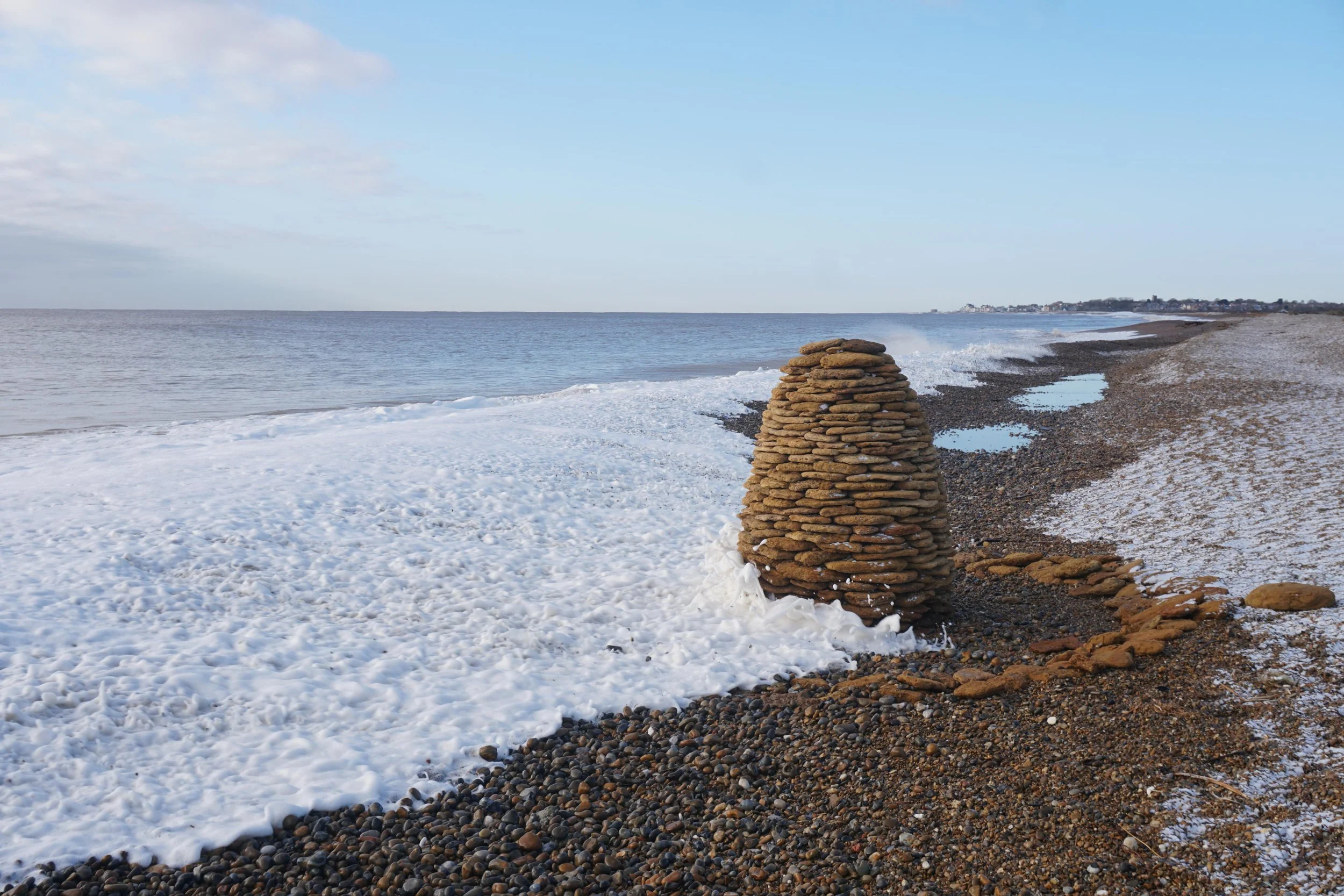 Thorpeness, UK, Feb-March, 2021. Ten days of strong easterly winds churn the sea into a brown murky mess while the beach turns white. At low tide I notice coralline crag being unearthed by the storm’s energy so I start collecting the rocks from a kilometre stretch of shingle beach. I continue daily for two weeks then start to build in the intertidal storm zone. I’m inspired by Julie Brook’s ‘Fire Stacks’, also my work in Iceland, part of which has included building cairns with groups of volunteers.